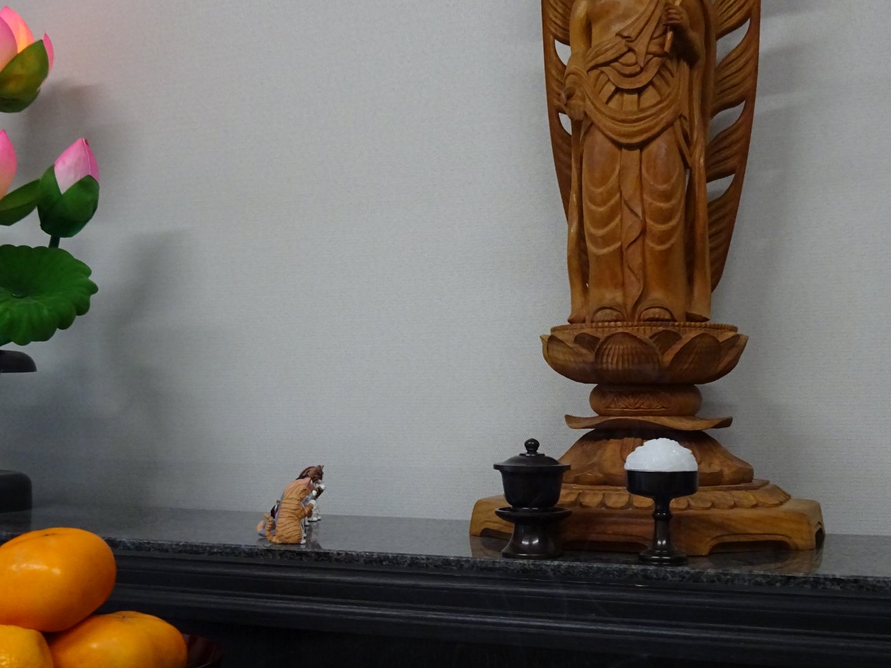 ご夫人は「あなたのお父様が請来した観音様ですから、あなたが引継ぐのがよいでしょう」と何十年も大事に拝んでいた観音様をその場で丁寧に布で包み、娘に渡しました。まるで観音様を託して安心したかのように、ほどなくこのご夫人は他界されたのです。数十年の時を経て父の観音様を引き継いだこの娘が当庵の庵主であることはいうまでもありません。